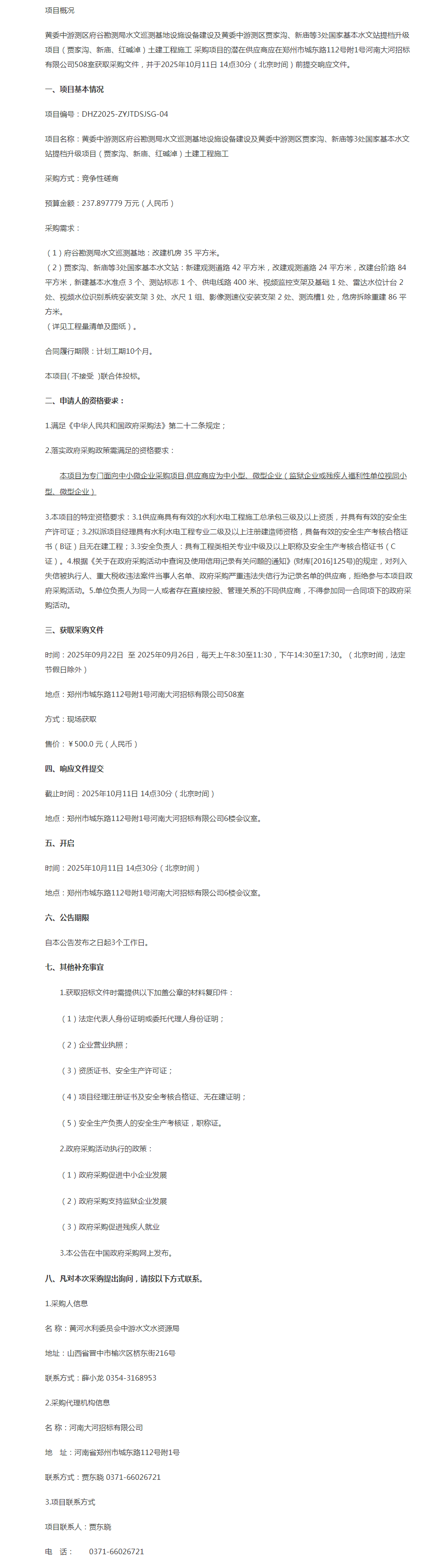 黄委中游测区府谷勘测局水文巡测基地设施设备建设及黄委中游测区贾家沟、新庙等3处国家基本水文站提档升级项目(贾家沟、新庙、红碱淖)竞争性磋商