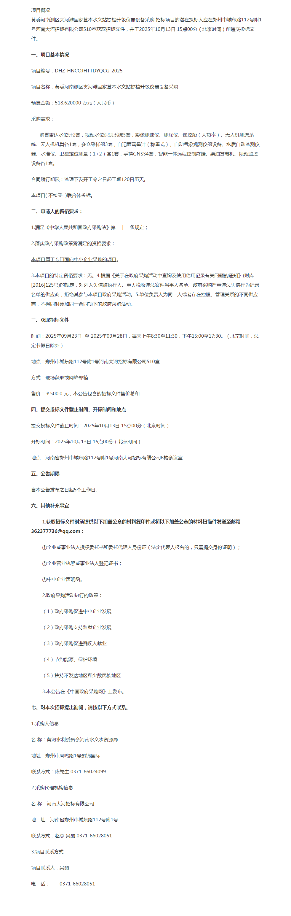 黄委河南测区夹河滩国家基本水文站提档升级仪器设备采购公开招标公告