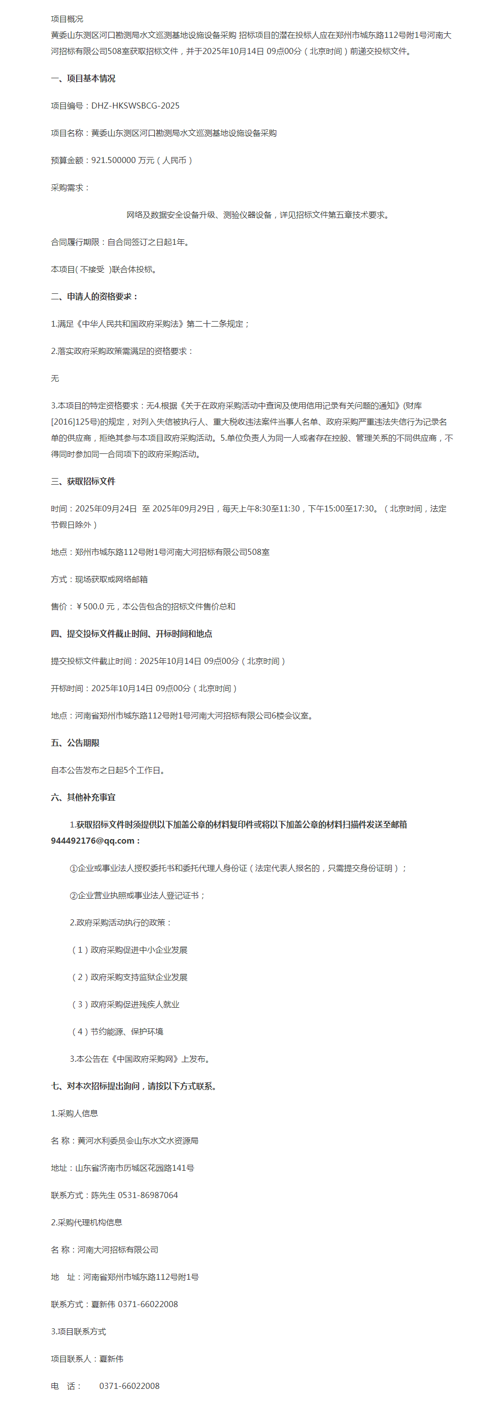 黄委山东测区河口勘测局水文巡测基地设施设备采购公开招标公告