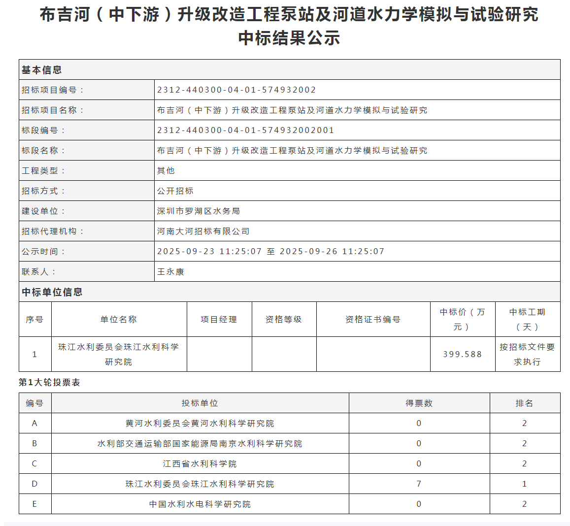 深圳市布吉河(中下游)升级改造工程泵站及河道水力学模拟与试验研究中标结果公示