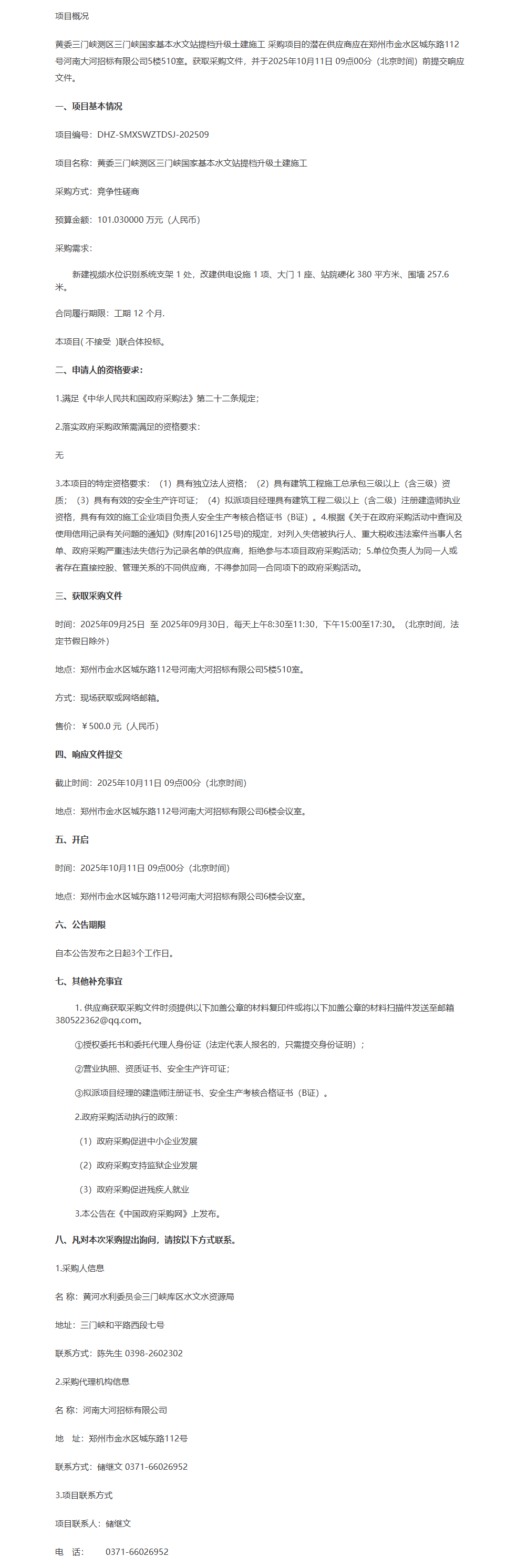 黄委三门峡测区三门峡国家基本水文站提档升级土建施工竞争性磋商