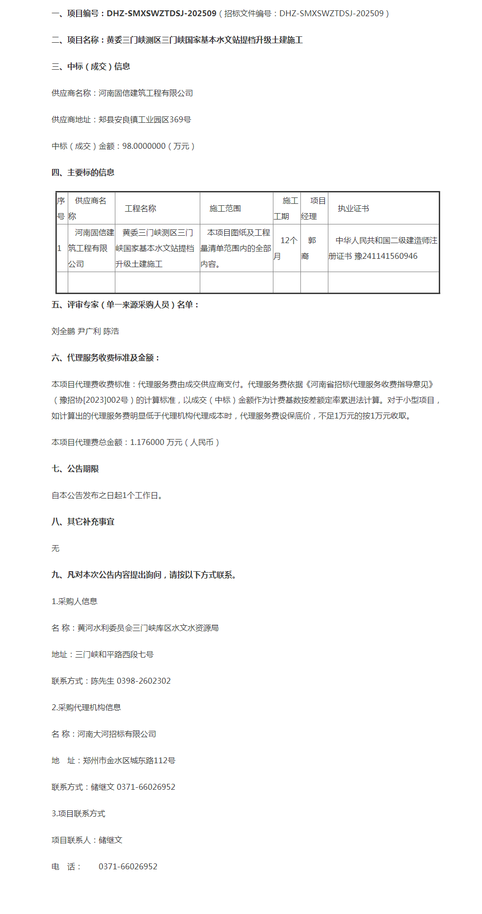 黄委三门峡测区三门峡国家基本水文站提档升级土建施工成交公告