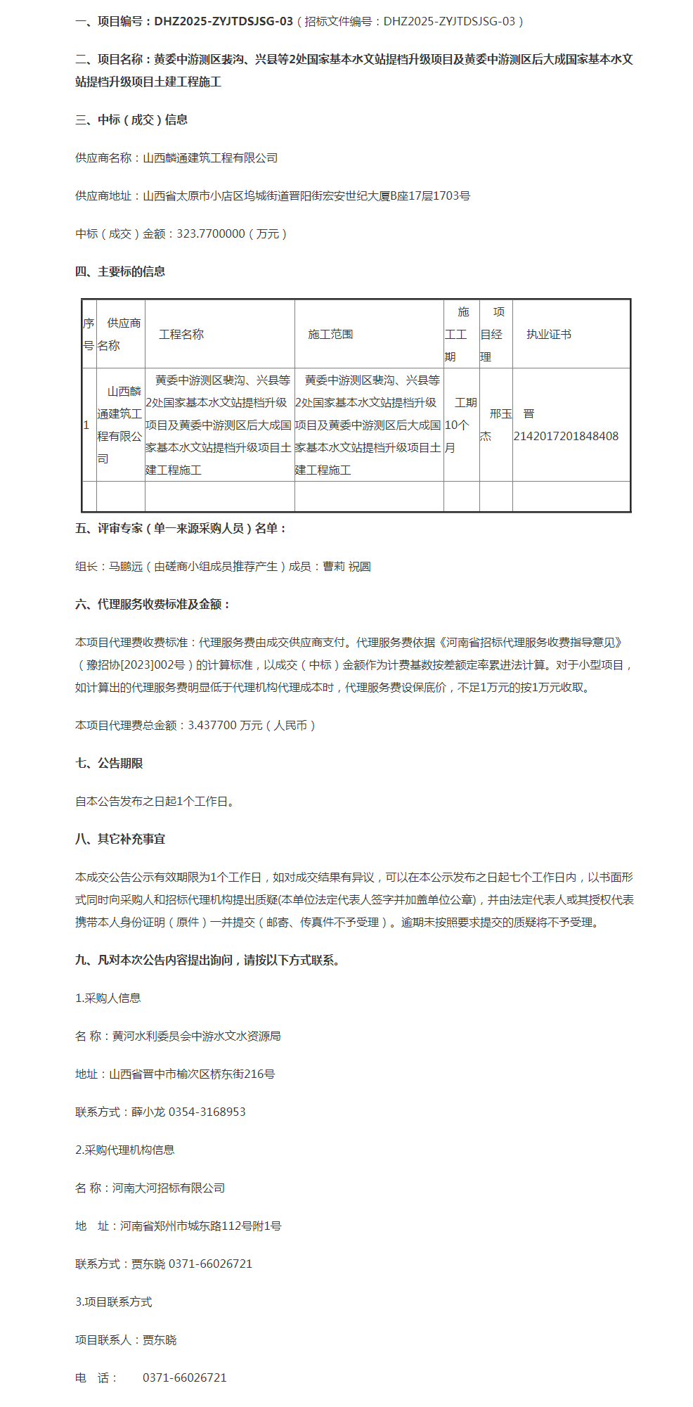 黄委中游测区裴沟、兴县等2处国家基本水文站提档升级项目及黄委中游测区后大成国家基本水文站提档升级项目土建工程施工成交公告