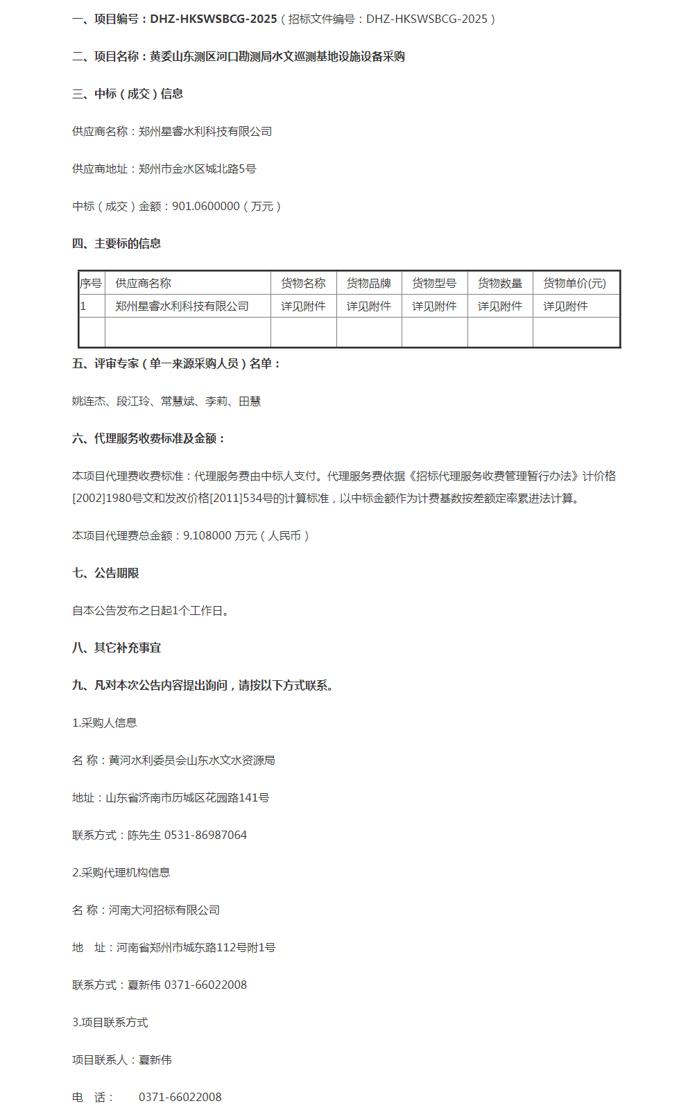 黄委山东测区河口勘测局水文巡测基地设施设备采购中标公告