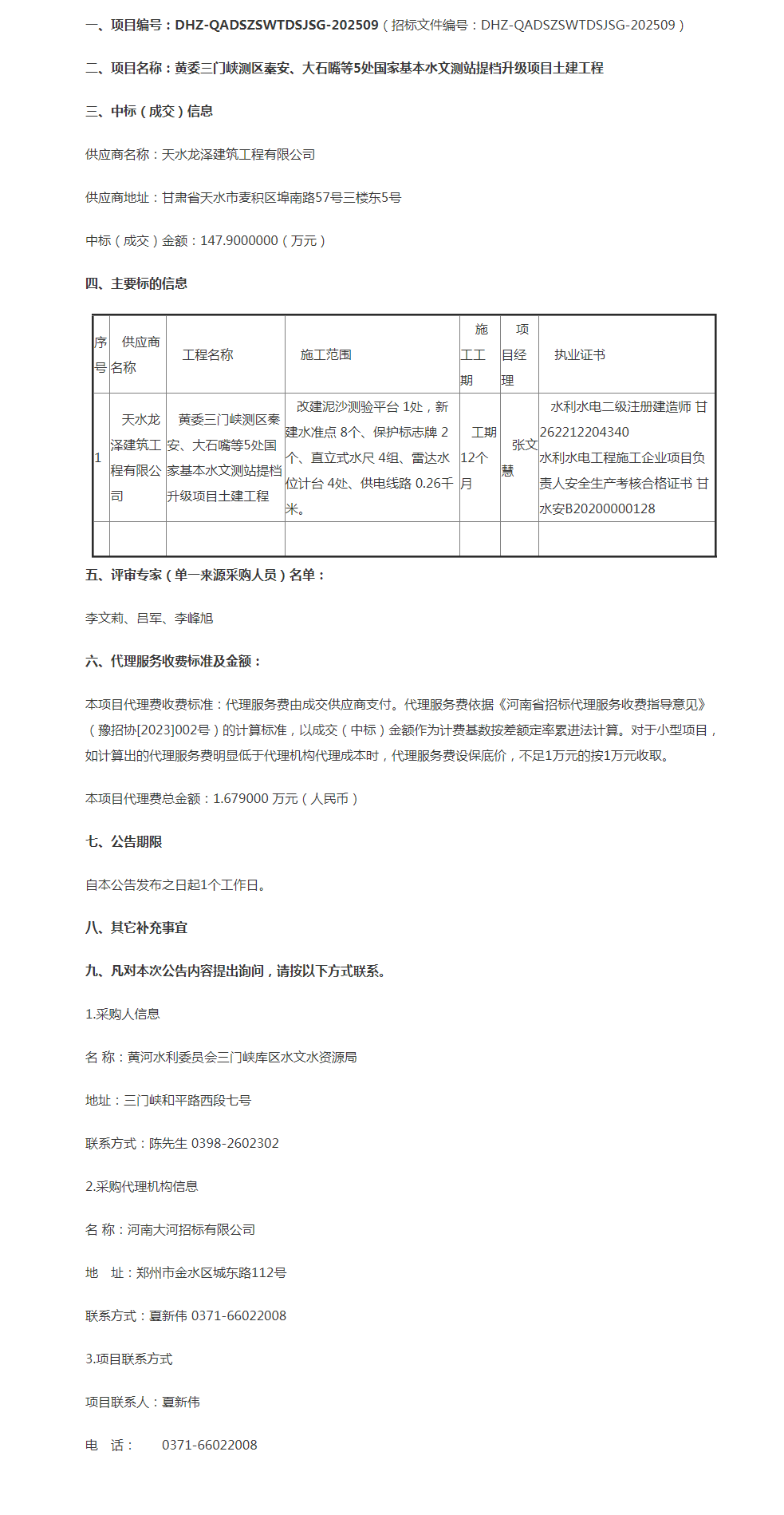 黄委三门峡测区秦安、大石嘴等5处国家基本水文测站提档升级项目土建工程成交公告
