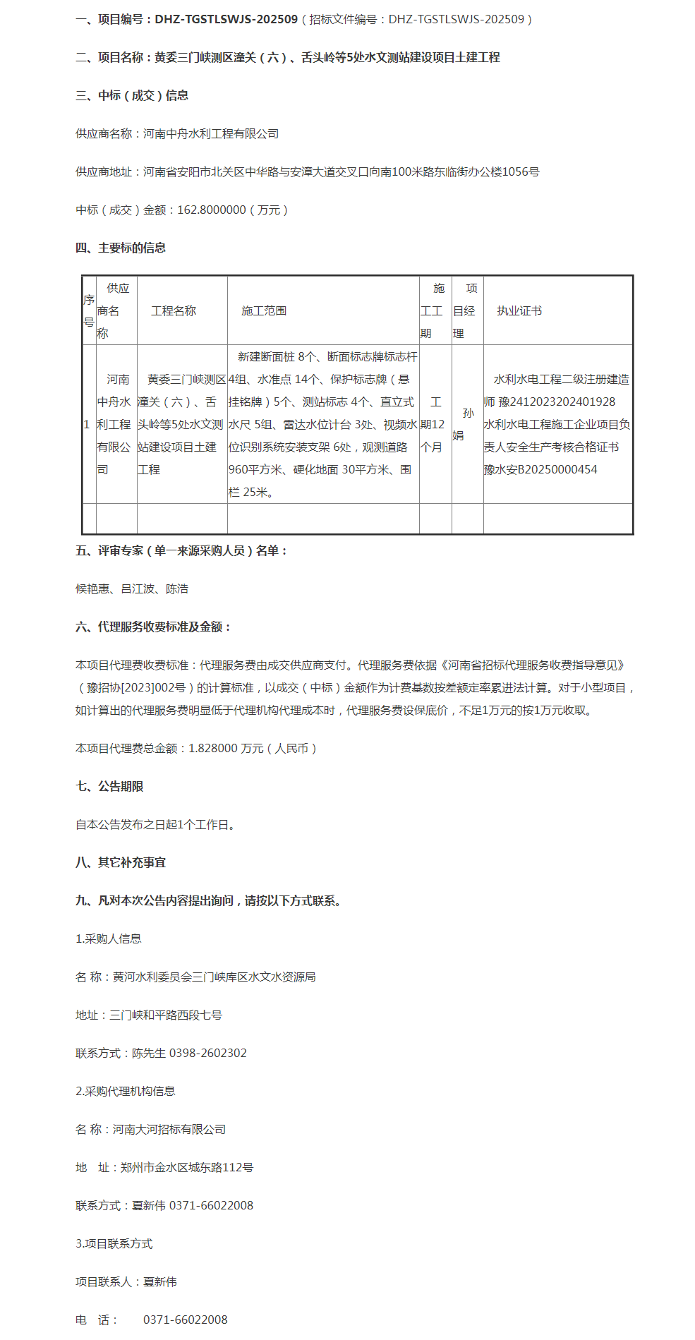 黄委三门峡测区潼关(六)、舌头岭等5处水文测站建设项目土建工程成交公告