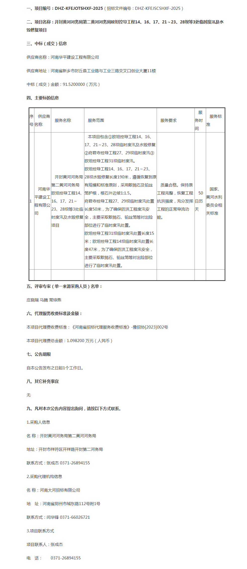 欧坦控导工程14、16、17、21~23、28坝等3处临时度汛及水毁修复项目成交公告