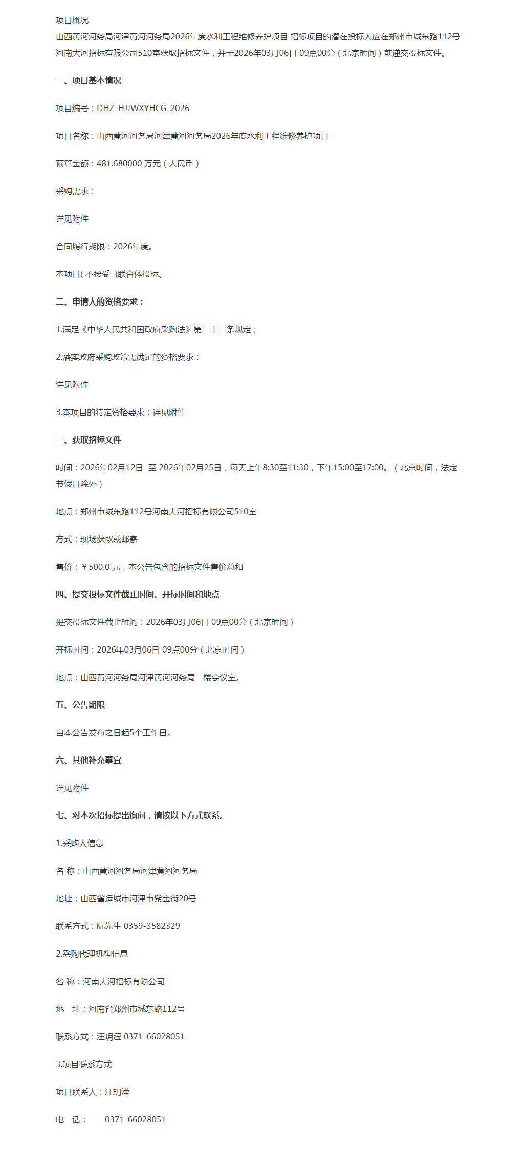 河津黄河河务局2026年度水利工程维修养护项目公开招标公告