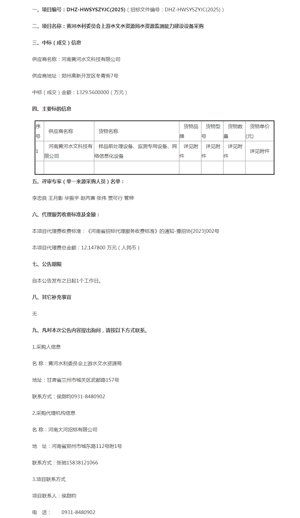 黄委上游水文水资源局水资源监测能力建设设备采购中标公告